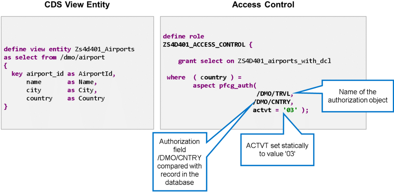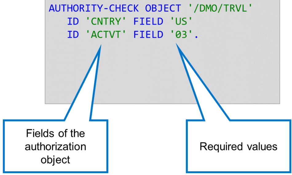you use the AUTHORITY-CHECK statement, specifying the authorization object and the required values. For example, AUTHORITY-CHECK checks against object /DMO/TRVL, requiring the user to have authorization with ‘US’ for field CNTRY and ‘03’ for field ACTVT.