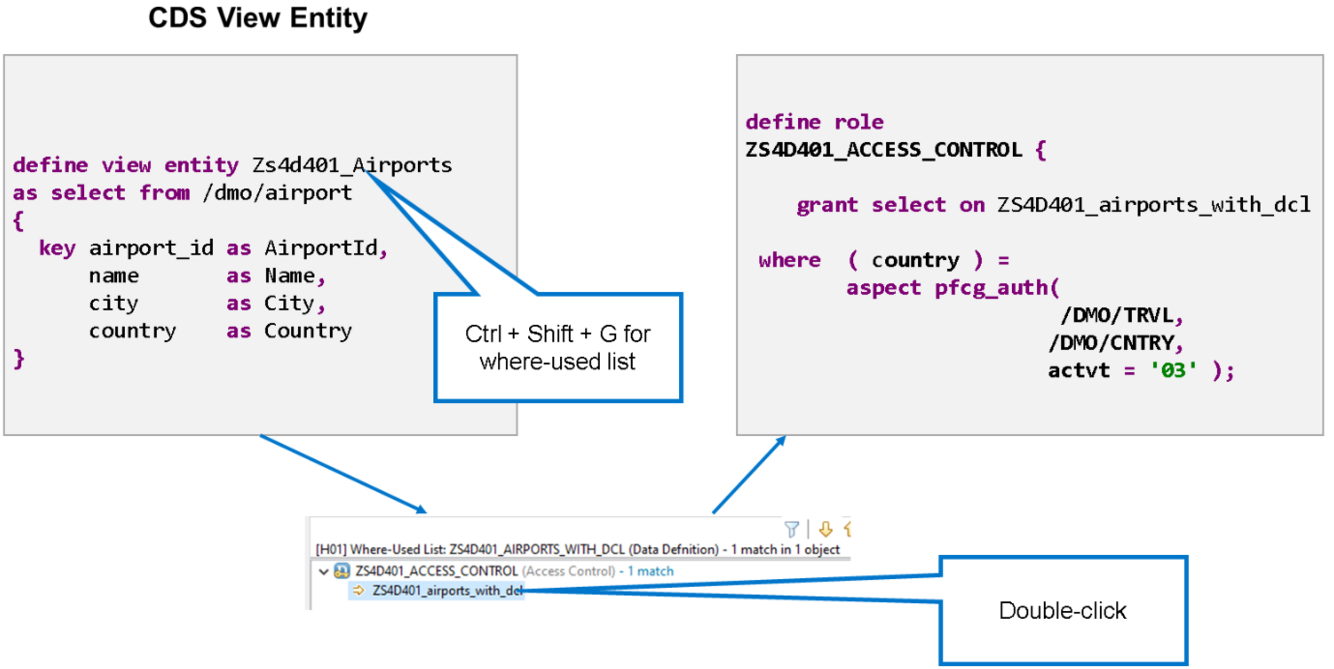 by placing the cursor on the name of the view entity in the editor and pressing Ctrl + Shift + G. This action loads the where-used list for the view entity, and if the view entity has an access control, it will be listed there.
