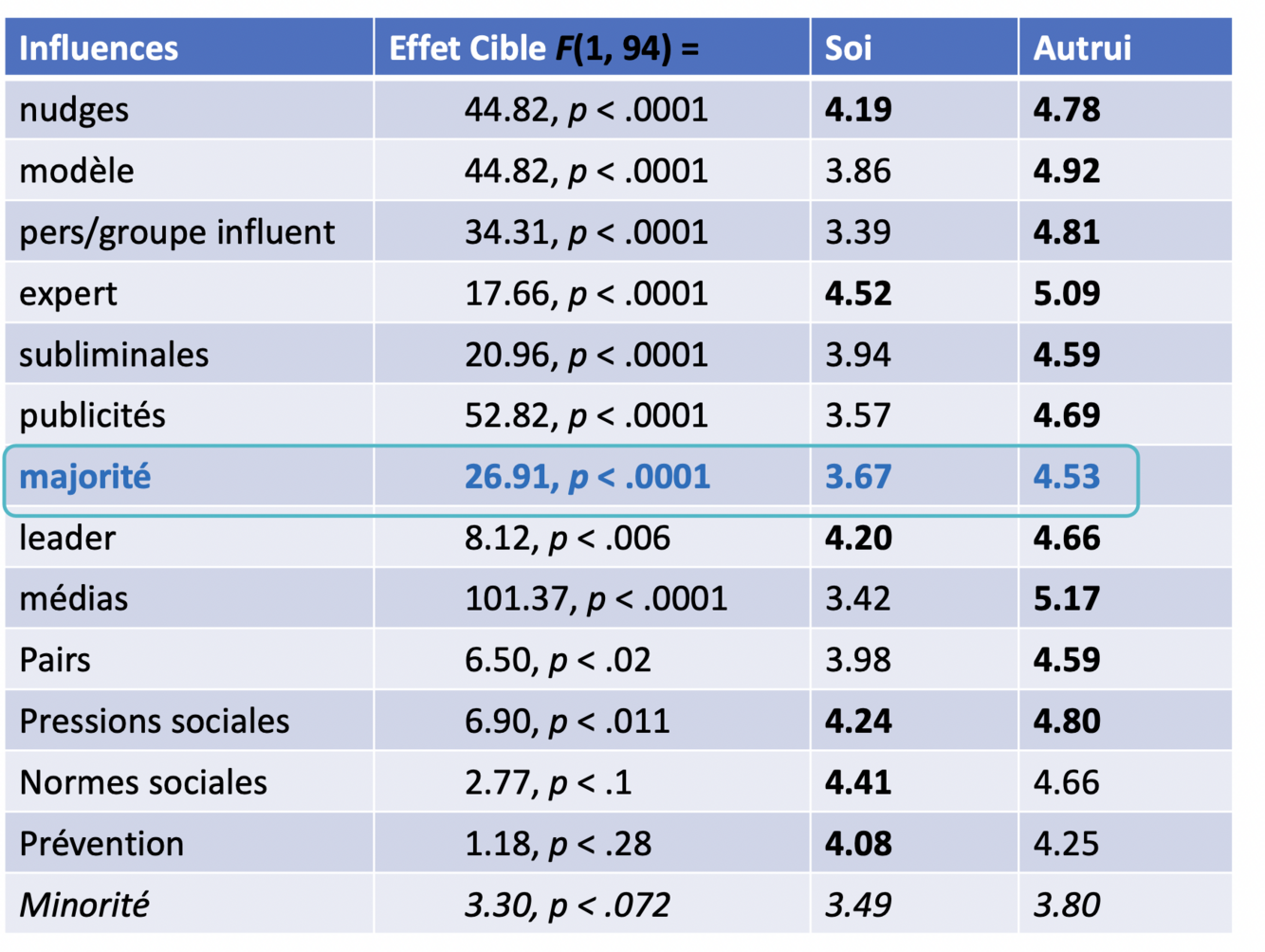 - Effet de la cible : Soi < Autrui observé pour 11 des 14 influences.