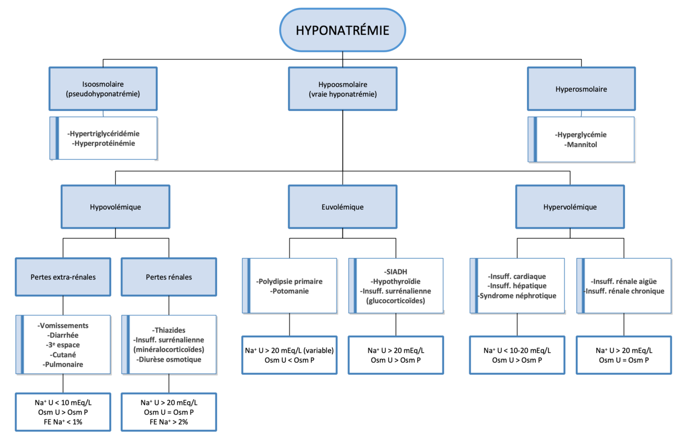 Décrire l’algorithme de l’hyponatrémie en énumérant les pathologies et la réponse rénale attendue