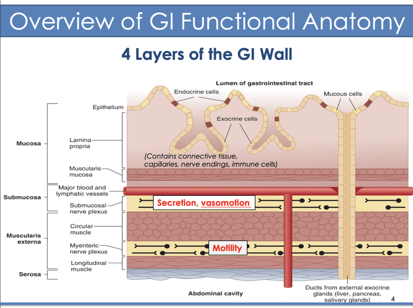 What are the 4 main layers of tissue that make up the barrier between the abdominal cavity and the lumen of the GI tract?