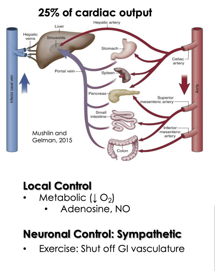 For extrinsic factors, the sympathetic NS can regulate blood flow to gut (ex: during exercise, SNS vasoconstricts vessels to gut to reduce blood flow)