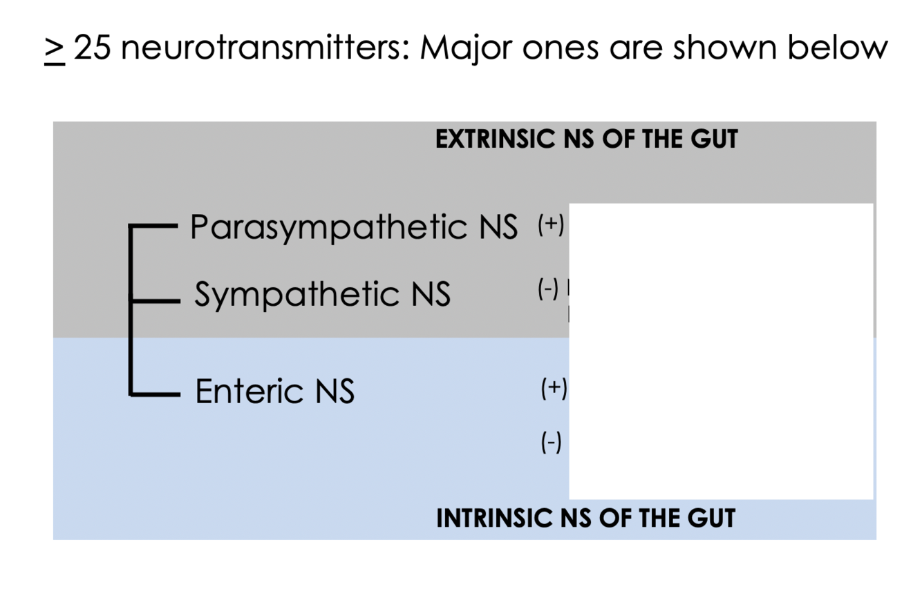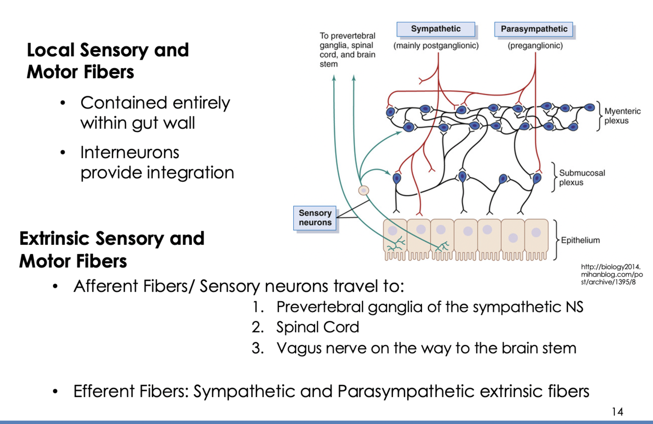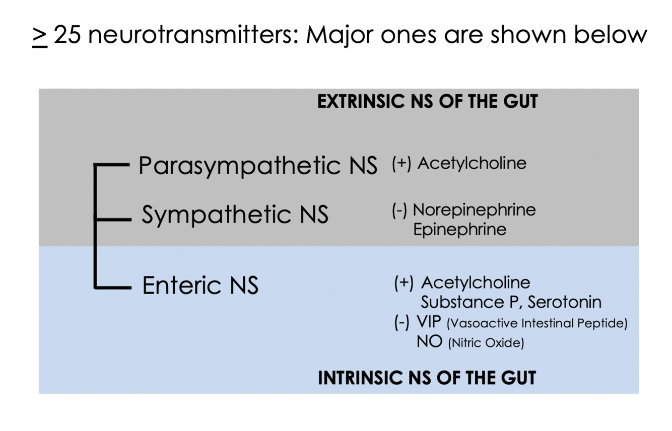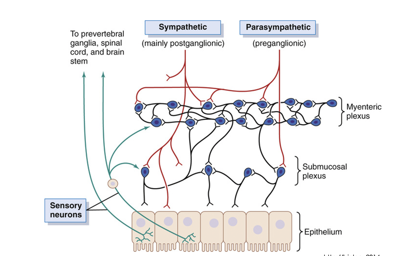 SNS (postganglionic) and PSNS (preganglionic) synapse on the plexi of the gut, which then affect the function of the gut wall cells. The gut wall also contains sensory neurons which can effect both the enteric plexi and/or send signals up to the prevertebral ganglia of SNS, the spinal cord, or the vagus nerve (up to brainstem).