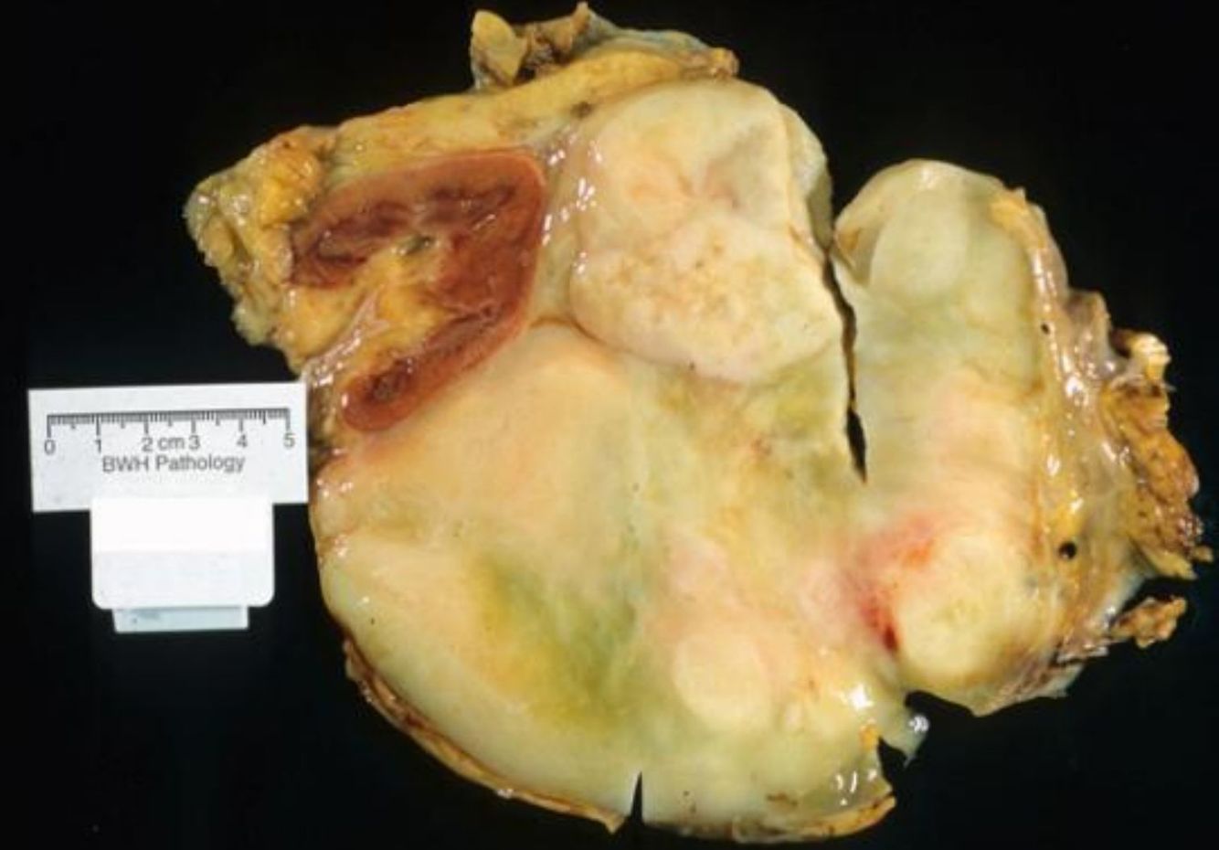 It is poorly circumscribed and infiltrates surrounding tissue (at upper left is a normal kidney encased by the tumor) and is heterogeneous, with hemorrhage and necrosis. On histological examination it is difficult to make out cell type, and hemorrhage and necrosis will often be seen (though not in this particular image)