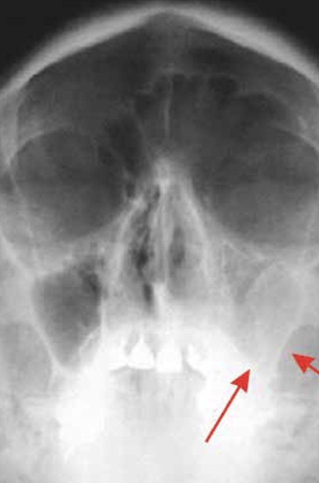 Nível hidroaéreo no seio maxilar direito e espessamento mucoso à esquerda. Radiografia