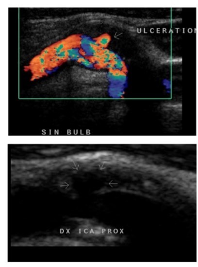 Plaque yta/ruptur (se krater i undre bilden), färgdopplern sätts på och vi kan se att blod svirar runt