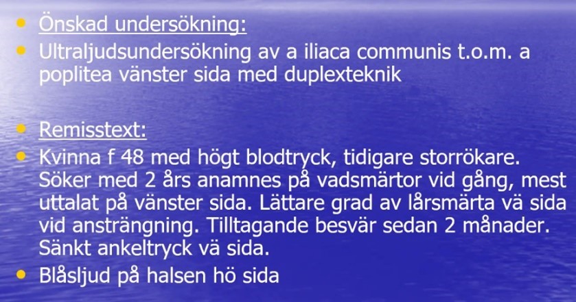 Smärtan har funnits länge och smärtan ökar vi ansträngning och tilltagande besvär. Om blåsljudet hörs bara vid carotis kan det vara lokalt därifrån (transkraniell doppler kan vara aktuell här), även duplex i benartärträdet kan vara aktuellt
