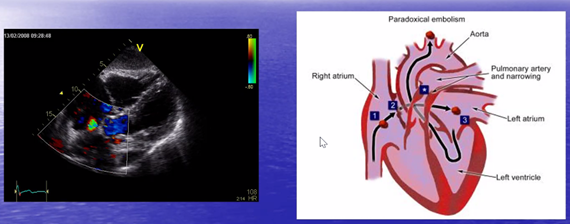 Den djupa ventrombosen kan embolisera framför allt till lunga men det finns ibland en shunt (foramen ovale) som gör att det kan nå systemkretsloppet direkt