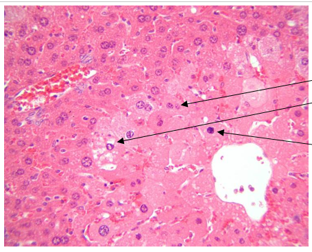 At the periphery of the centrilobular zones, there is a zone in which there are many enlarged hepatocytes with very pale, sometime granular cytoplasm and a perinuclear clear space.