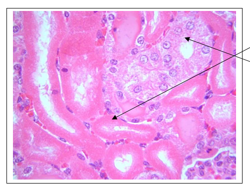 Throughout the renal cortex, tubules are lined by an eosinophilic coagulum of necrotic cells or by pale, swollen epithelial cells. Many swollen cells contain eosinophilic “droplets” which probably represent residual bodies or myelin figures as seen by EM.