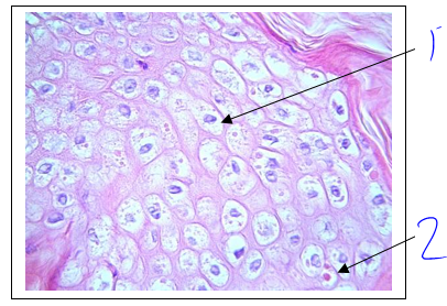 Follow along the epidermis until you find where it is markedly thickened and composed of large clear cells. The nuclei are surrounded by a large clear space in the cytoplasm. This lesion is referred to as acute cell swelling and “ballooning degeneration” when it becomes extreme. The extreme cell swelling is accompanied by cytoplasmic keratinolysis and proteolysis. The lesion is typically caused by pox virus infections or acute thermal injury to epithelium.
