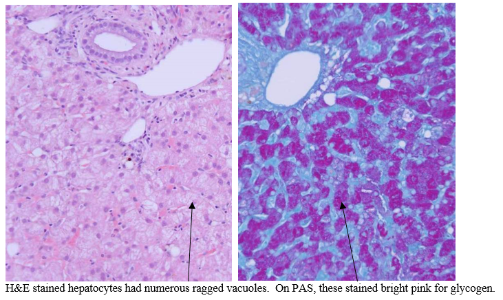 In fact, this gross appearance of a pale, swollen, yellow liver could be consistent with lipidosis (fatty change) or hydropic degeneration. The histologic lesions confirm a diagnosis of hydropic degeneration—i.e. storage of excess glycogen (rather than lipid) in the hepatocytes. Take home message: a diffusely pale swollen liver can arrive at that state due to accumulation of either glycogen or lipid; there are different (though overlapping) metabolic routes to these syndrome that we will cover in the future).