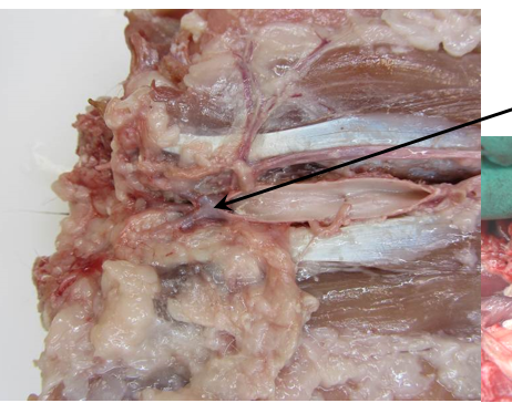This lesion is an example of a saddle thrombus in which cardiac thrombi lodge at the bifurcation of the aortic and iliac arteries. This kind of lesion is often seen in cats and dogs with primary cardiomyopathy, as thrombi may form within the left atrium due to turbulent blood flow through the left heart. The occlusion of the aorta and iliac arteries leads to hind limb ischemia and may present as paralysis, cold hind legs.
