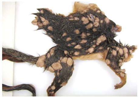These lesions are caused by Squirrel poxvirus (a leporipoxvirus) resulting in multiple fibromas, termed squirrel fibromatosis.