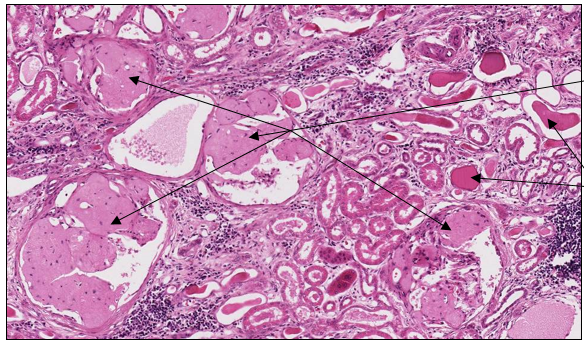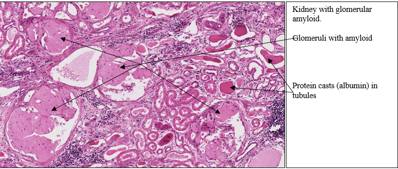 Most glomeruli are enlarged, distorted, or obliterated by a homogeneous, eosinophilic (hyaline) substance. The hyaline material is amyloid as confirmed by the Congo red stain. Amyloid is deposited first in the mesangium and later in the peritubular space. Amyloid disrupts the glomerular filtration mechanism leading to loss of plasma proteins into the urine filtrate.