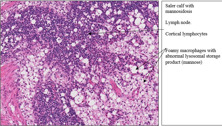 The fact that macrophages and cells in other tissues have vacuoles and the fact of the animal’s clinical history suggest a lysosomal storage disease. In this case, the disease is an autosomal recessive disease of Saler calves (and goats) called beta mannosidosis. One of the enzymes that catabolize mannose, beta mannosidase, is deficient resulting in incomplete metabolism and storage of saccharides containing mannose in storage vacuoles, likely lysosomes.