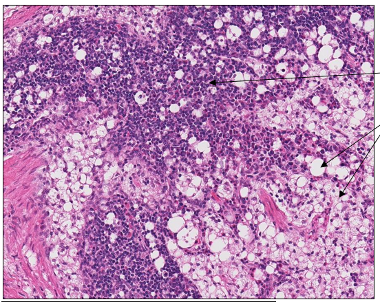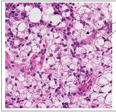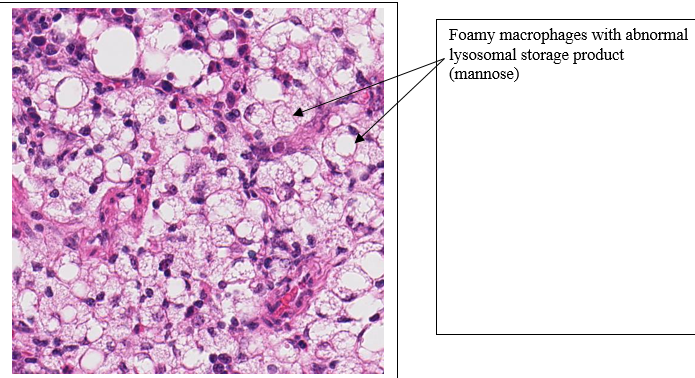 If these vacuoles are composed of lysosomes as are the vacuolated cells in the other tissues, and if the vacuoles are not triglycerides, what is the likely cause? What is the possible general pathogenesis?