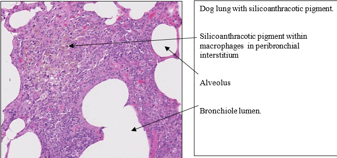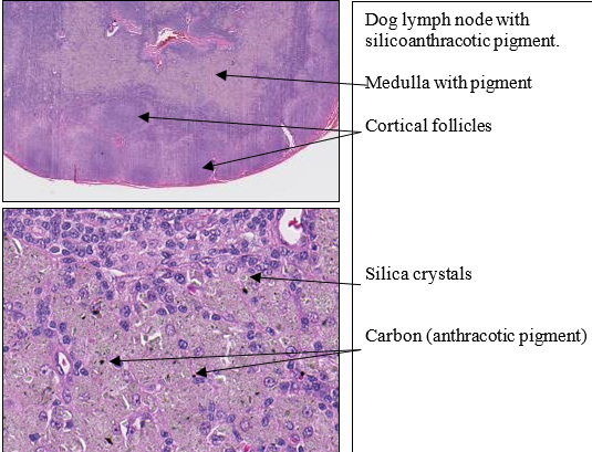 Lung has multifocal aggregates of macrophages, often adjacent to airways, that contain irregular, clear, refractile crystals and small dark to black particulate matter. The macrophages of the medulla have similar material, both the irregular clear crystals and the small black particles. These were incidental findings in the necropsy, but tell us something about the dog’s history.