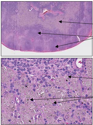 Within the leptomeninges, there are locally extensive and bilaterally simetrical, well demarcated areas of brown to black pigmentation which cover up approximately 40% of the surface of the cerebrum and brainstem and do not extend into the parenchyma on cut surface. The intact hemisphere contains mildly congested meningeal vessels.