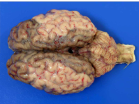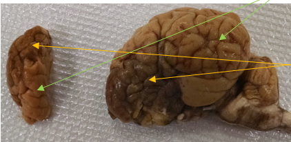 Signalment and history: Hemisphere from a 2 day old calf that became febrile, acidodic, failed to nurse and died despite intervention. Cerebral fragment from the brain of a 900lb steer with polioencephalomalacia. These brains contain internal lesions. For this lab, focus on the external surface of the tissues.