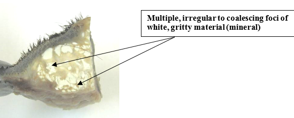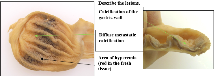Stomach: the gastric wall is diffusely and slightly thickened. In the middle area of the body, there is a dark brown band in the mucosa, which was red by the time of the necropsy. The mucosa is and rough due to multifocal and opaque, 1- 2mm in diameter circular lesions with a gritty texture. On the cut surface, the mucosa and submucosa are multifocally white and opaque (mineralization).