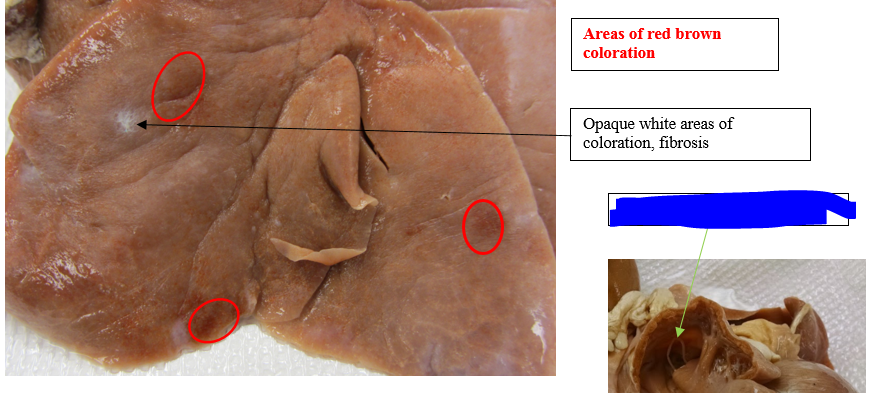 Signalment and history: Tissue is from a 5 year old, miniature mare who had foaled 10 days ago. Mare had a 5 day history of anorexia, depression. On physical exam she had yellow sclera and dehydrated status. Serum chemistry revealed elevated hepatic enzymes (GGT, ALP, AST) and creatine kinase.