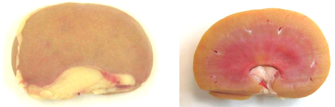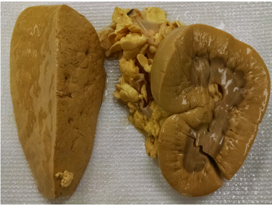 The liver is diffusely pale yellow, friable and appears to bulge slightly on the cut edge (swelling). Edges are rounded. Renal cortices are expanded, pale, yellow and the organ is friable.