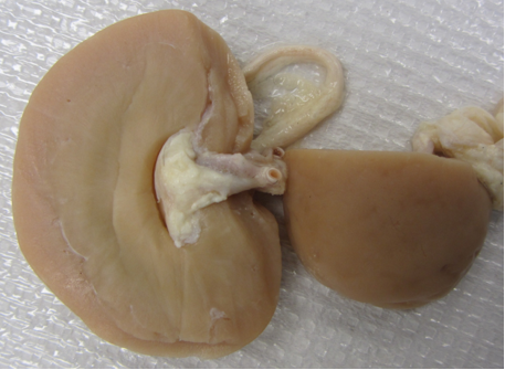 The kidney is moderately enlarged and diffusely pale. with red streaks present in the medulla. On the capsular and cut surfaces of the cortex, there are multiple, white to tan, pinpoint foci scattered throughout. By the time of the necropsy, red streaks could be seen in the renal medulla.