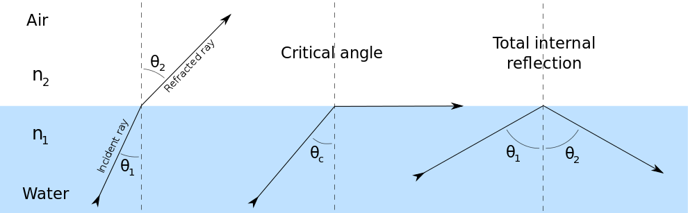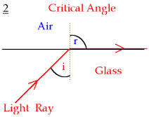 less dense to more dense medium - critical angle is the largest angle of refraction, corresponding to the grazing incident ray