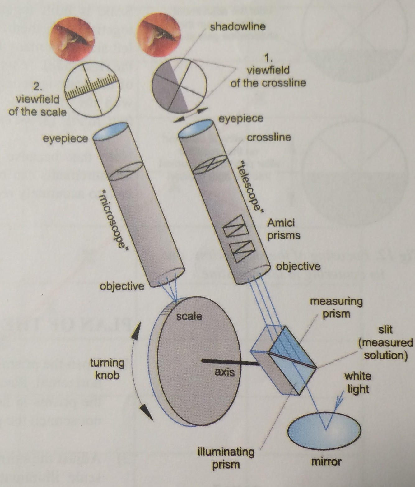 it determines the position of the shadowline at the edge of the Snell’s window created when light passes through the solution and into a measuring prism of very high refractive index