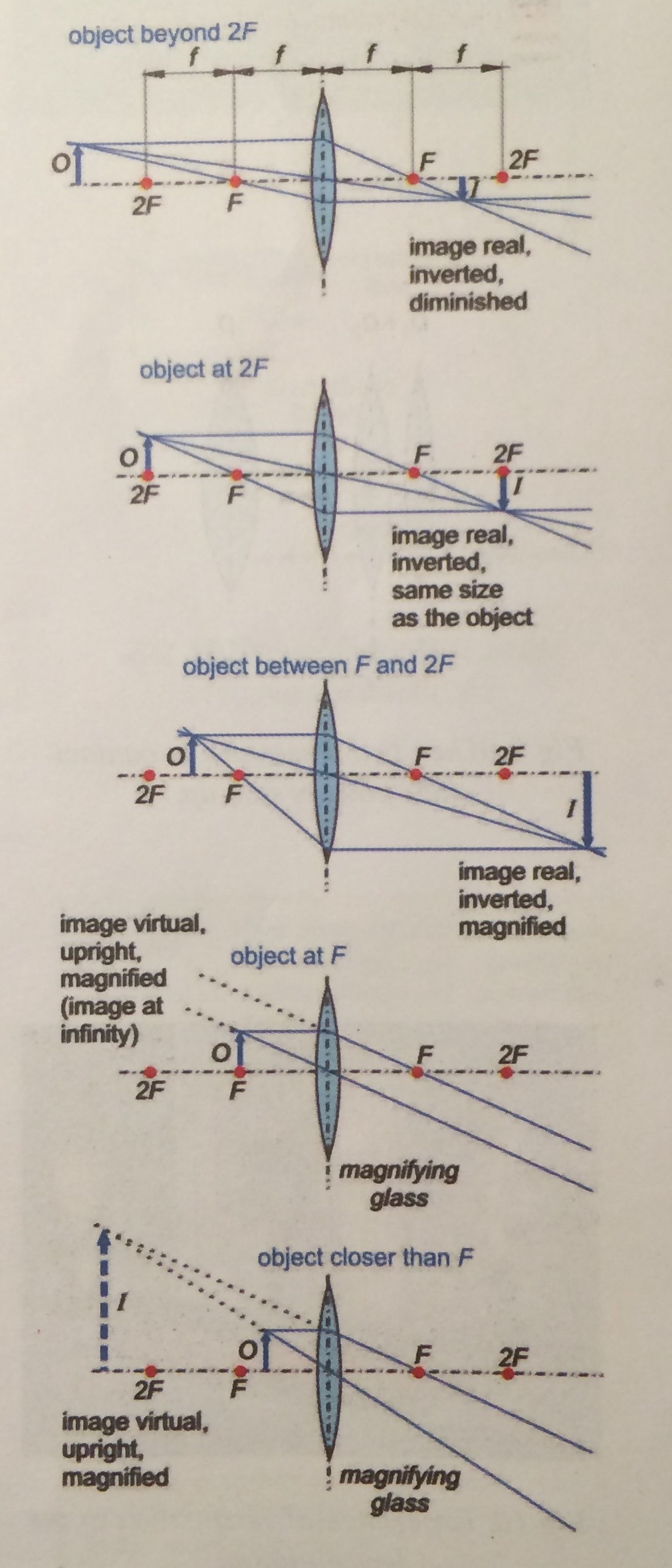 What are the five scenarios of an object’s distance from the lens in relation to once (F) and twice (2F) the focal point ?