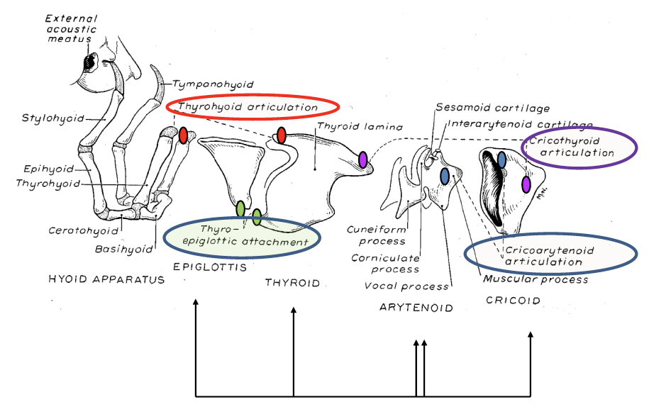 arytenoids and thyroid cartilage –> cricothyroid articulation and cricoarytenoid articulation