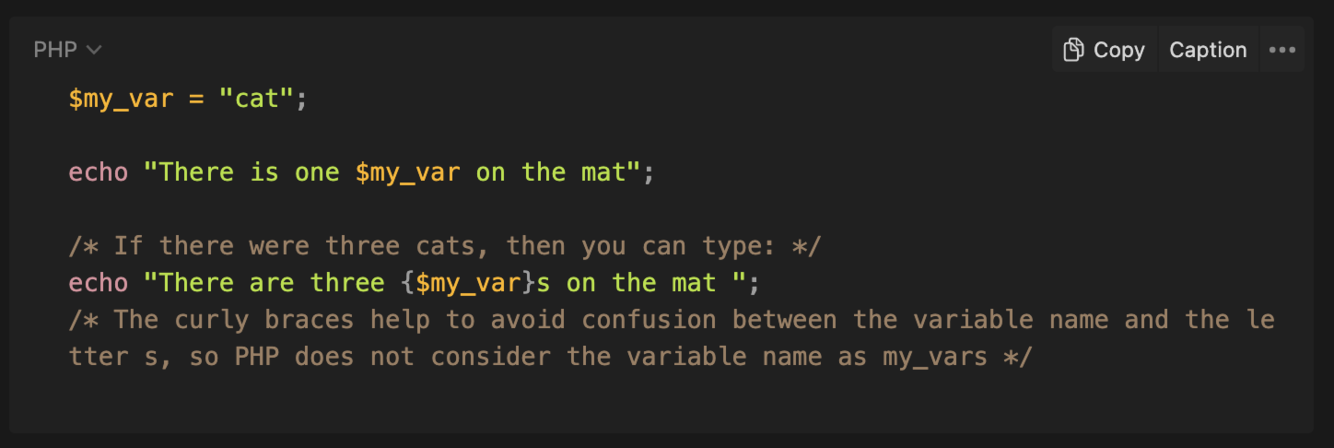 When additional valid identifier characters (ie. characters that could be included in a variable name) are intended to appear adjacent to the variable’s value, the variable name can be wrapped in curly braces {}, thus avoiding confusion as to the variable’s name.