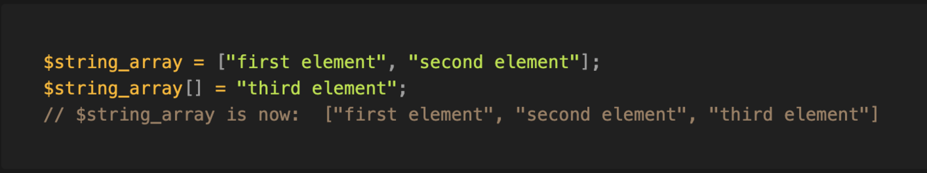 In PHP, elements can be added to the end of an array by attaching square brackets ([]) at the end of the array’s name, followed by typing the assignment operator (=), and then finally by typing the element to be added to the array.