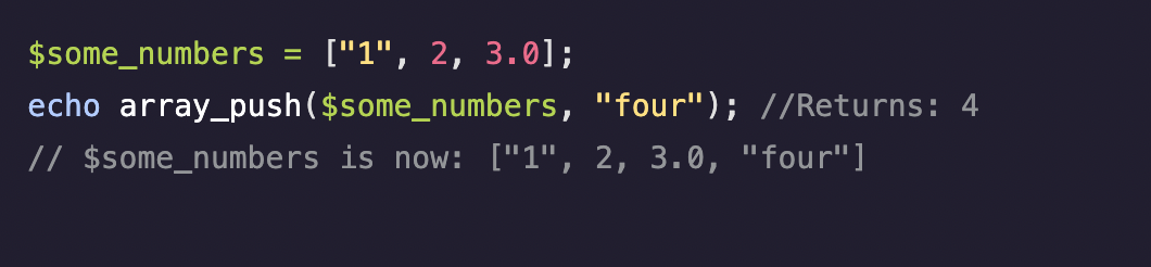 The PHP built-in array_push() function takes an array as its first argument. The arguments that follow are elements to be added to the array.