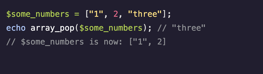 The PHP built-in array_pop() function takes an array as its argument. It permanently removes the last element of an array and returns the removed element.