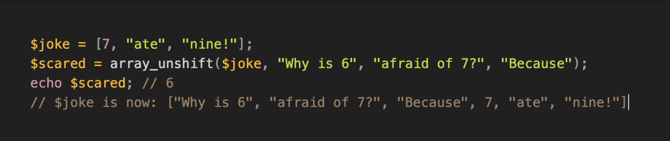 The PHP built-in array_unshift() function takes an array as its first argument. The arguments that follow are elements to be added to the array.
