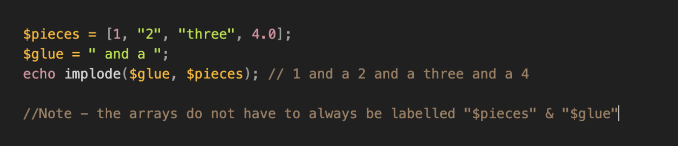 The function returns a single string with the string argument, known as the $glue, inserted between each element in the array, known as the $pieces.