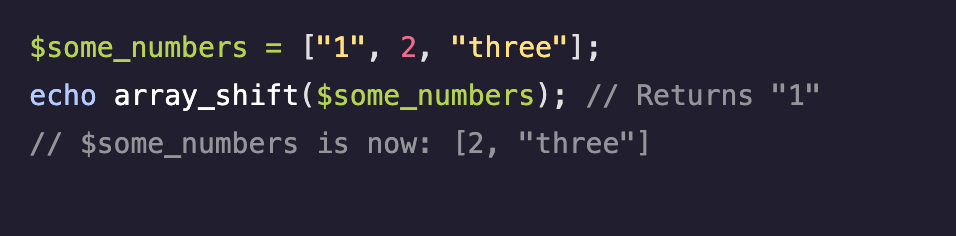 The PHP built-in array_shift() function takes an array as its argument, permanently removes the first element from the array, and returns the removed element. All the elements in the array will be shifted to an index one smaller than their previous index.