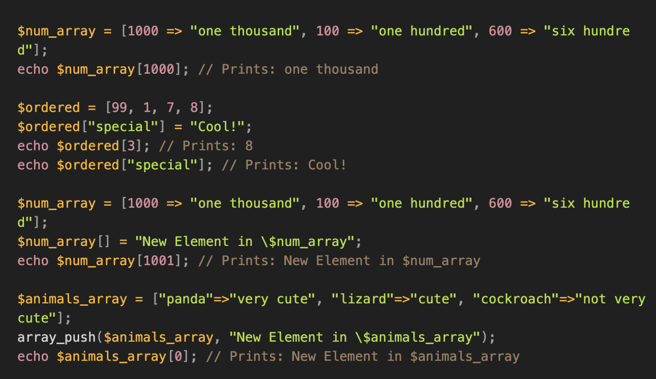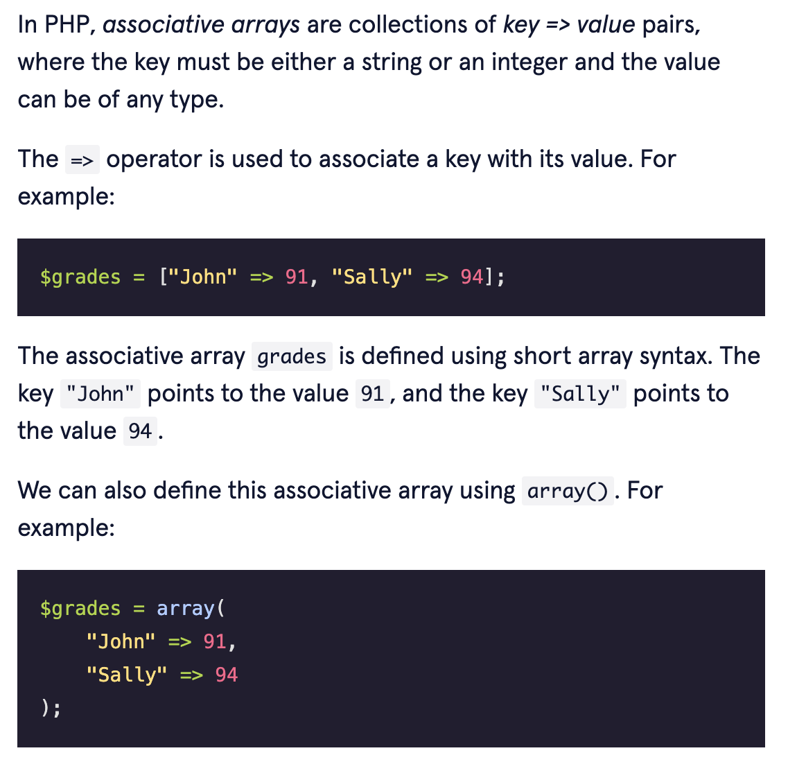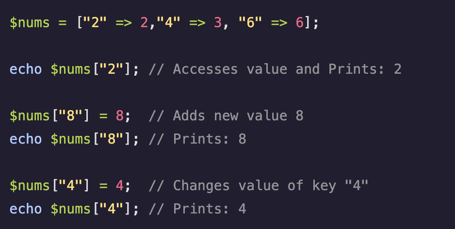 In PHP, we can access the value that a given key points to using square brackets ([]) and the key. To add new elements to an associative array, we can use the assignment operator (=). We can also change existing elements using the same syntax that adds new array elements.