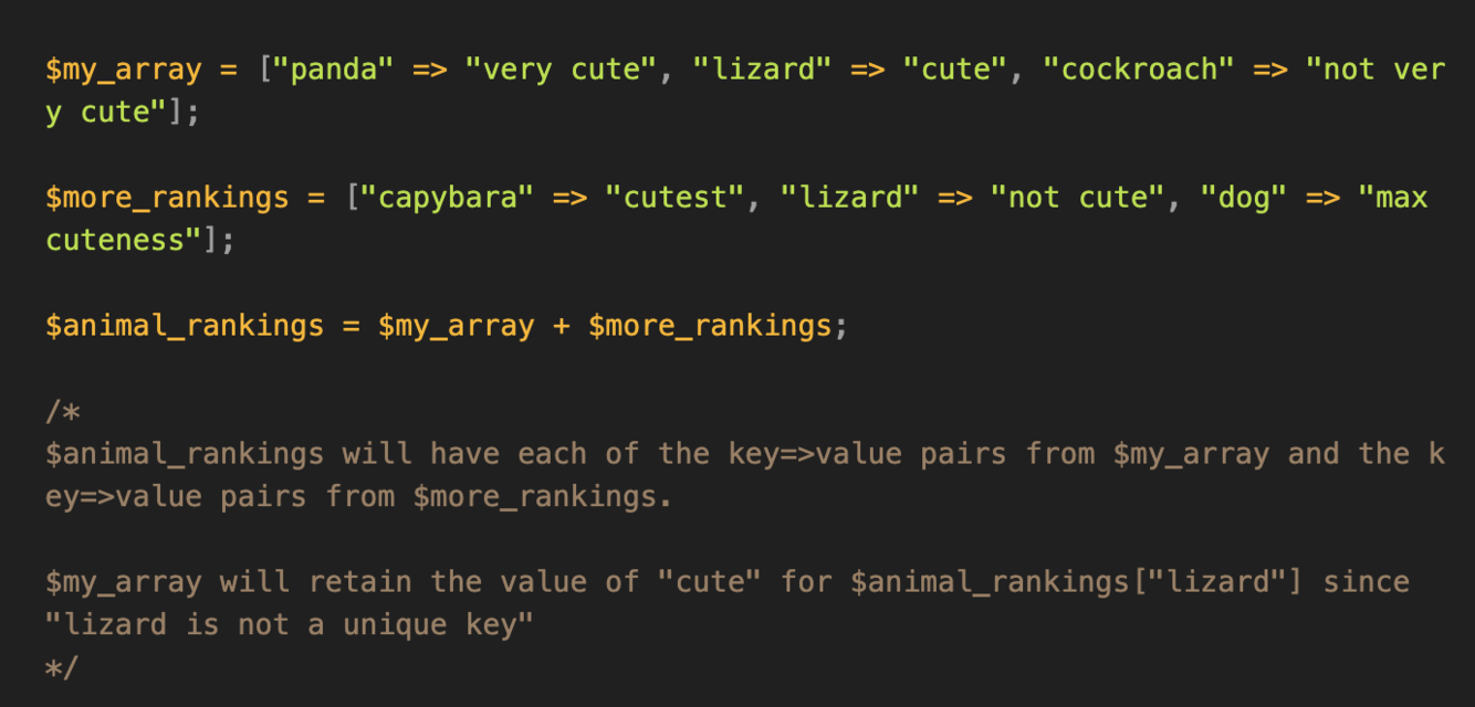 In PHP, the union (+) operator takes two array operands and returns a new array with any unique keys from the second array appended to the first array.