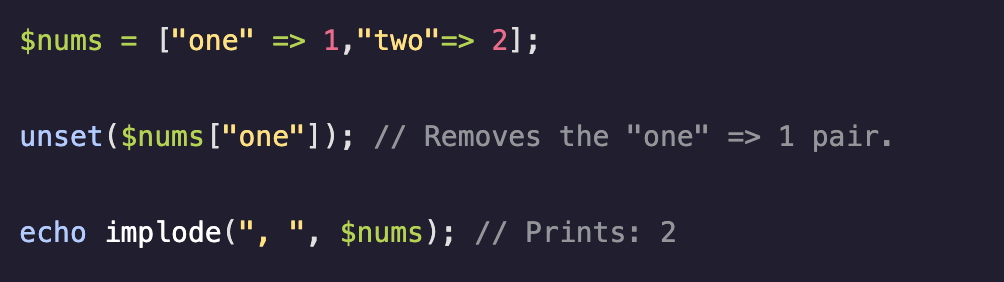 A key=>value pair in a PHP associative array can be removed entirely using the PHP unset() function.