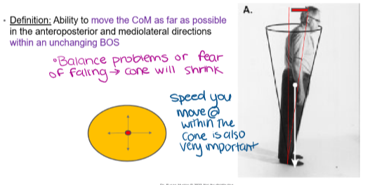 Ability to maintain positions of the CoM in unsupported stance when BOS does not change