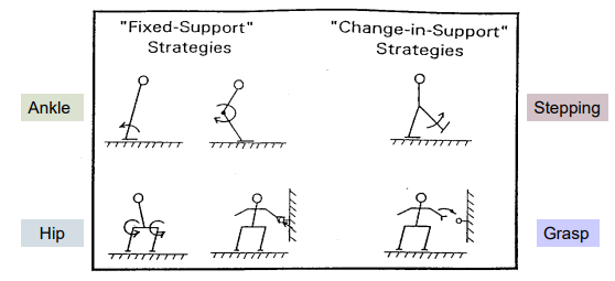what are the 2 fixed support strategies and 2 change-in-support strategies seen in reactive postural control?