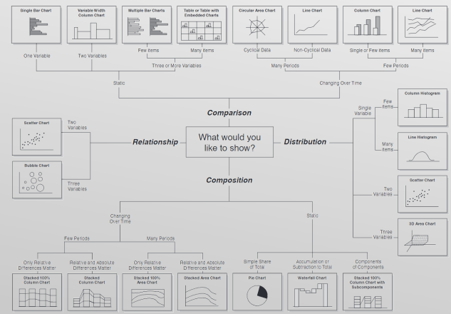 - 1D: Liniendiagramm (für Vergleiche), Balkendiagramm (für Verteilungen), Stacked Balkendiagramm (Composition), Pie Chart (Composition),