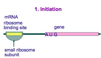initiation: recognition of binding site, translocation of small subunit to AUG, then finished