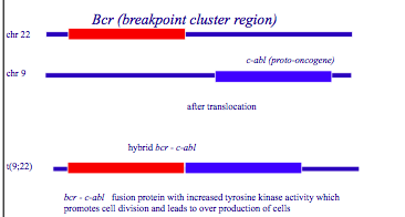 when swapped this c abl next to bcr so not kept in check anymore-made hybrid gene from the proto oncogene that produced compound interfered with cell replication leading to CML, translocation caused the leukamia-example of translocation gross mutation