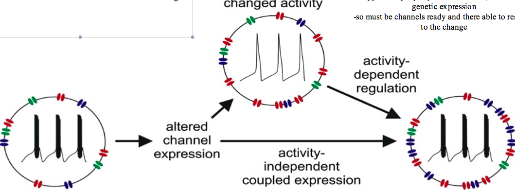 -if new channel is expressed on the membrane that alters the excitability of the cell then within a very short period of time (minutes) will lead to expression of ion channels that will bring the cell’s activity back to normal -happens too quickly to be genetic expression, there must be channels ready to respond to change!