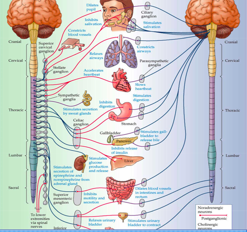 -the same muscles or cells get the innervation from sympathetic and parasympathetic— heart pacemaker cells parasympathetic= slows heart rate, sympathetic= faster heart rate (faster firing of the pacemaker cells)