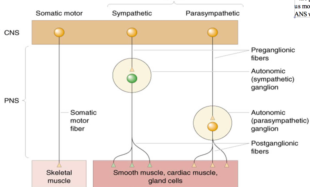 -somatic motor neurons= have body in CNS and protected form the environment by the blood brain barrier and go to target -ANS- has an intrevening synapse, in ganglia